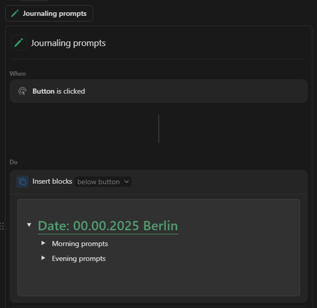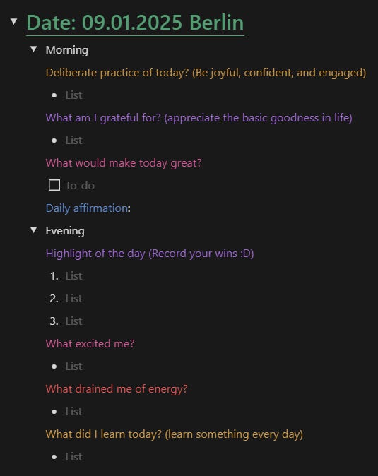 (from 00.00.YEAR → 00.Month.YEAR) and then just fill in the days by handThe Toggle list and Indents (TAB) → To collapse my prompts so I can easily delete them and write without them or just use the Evening prompt set since I often don’t use the Morning prompt set.